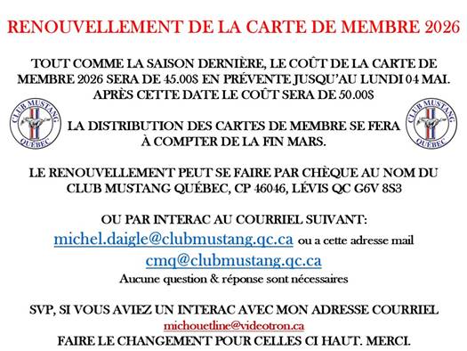 Deuxième date à retenir, date de la première activité officielle du calendrier, le 21 Mars 2026 : c’est la sortie du Club Mustang à la cabane à sucre. Il s’agit du même endroit que l’an passé, c’est-à-dire La Cabane à Sucre chez Michel Lapointe (1095, route Fraser, Beauceville, QC, G5X 2G8). Un convoi sera organisé à partir du Normandin Bernières (530, rue de Bernières, Lévis, QC, G7A 1E1) à 9:30 am. Pour vous inscrire, veuillez le faire via la page Facebook du Club Mustang Québec (membres), en inscrivant votre nom et le nombre de personnes. Vous avez jusqu’au 7 Mars 2026 pour vous inscrire.
