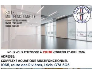 Première date à retenir, le 17 Avril 2026 : Ceci est la date de la réunion générale du Club Mustang Québec, date à laquelle le calendrier de la saison 2026 sera dévoilé. Cette réunion générale aura lieu au Complexe Aquatique Multifonctionnel à Lévis (1065, route des Rivières, Lévis, QC, G7A 5G5), à compter de 19:30