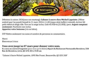 Le printemps est arrivé et le temps de sortir nos bolides s’en vient très bientôt! Pour ouvrir la saison, c’est demain le 21 mars 2026 qu’aura lieu notre sortie annuelle à la cabane à sucre.