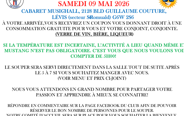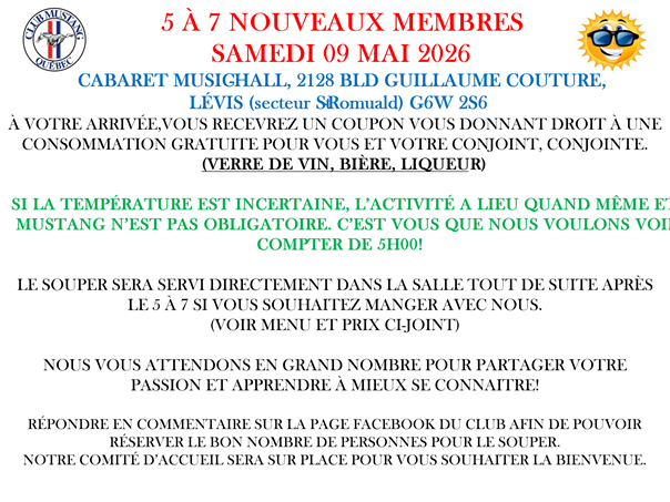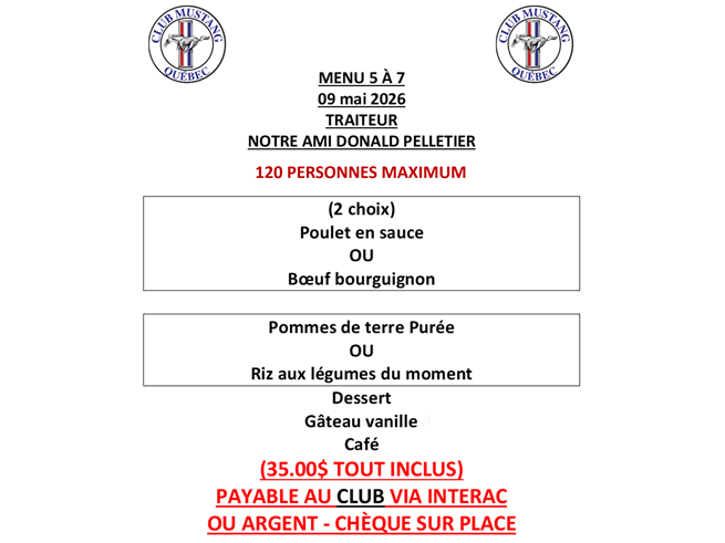 Comme envoyé par notre président via courriel, voici les informations de la prochaine activité qui aura lieu le 9 mai 2026. Vous trouverez le menu pour le 5 à 7 ci-dessous.
